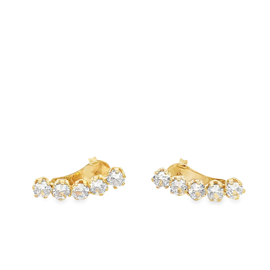Elevate your elegance with these Round Bezel 5 CZ Stone Ear Blazed Earrings. Featuring five sparkling cubic zirconia stones set in a sleek round bezel design, these earrings gracefully arc along the ear for a refined and modern look. Perfect for adding subtle sophistication to any outfit, they offer a timeless sparkle that complements both day and evening wear.
