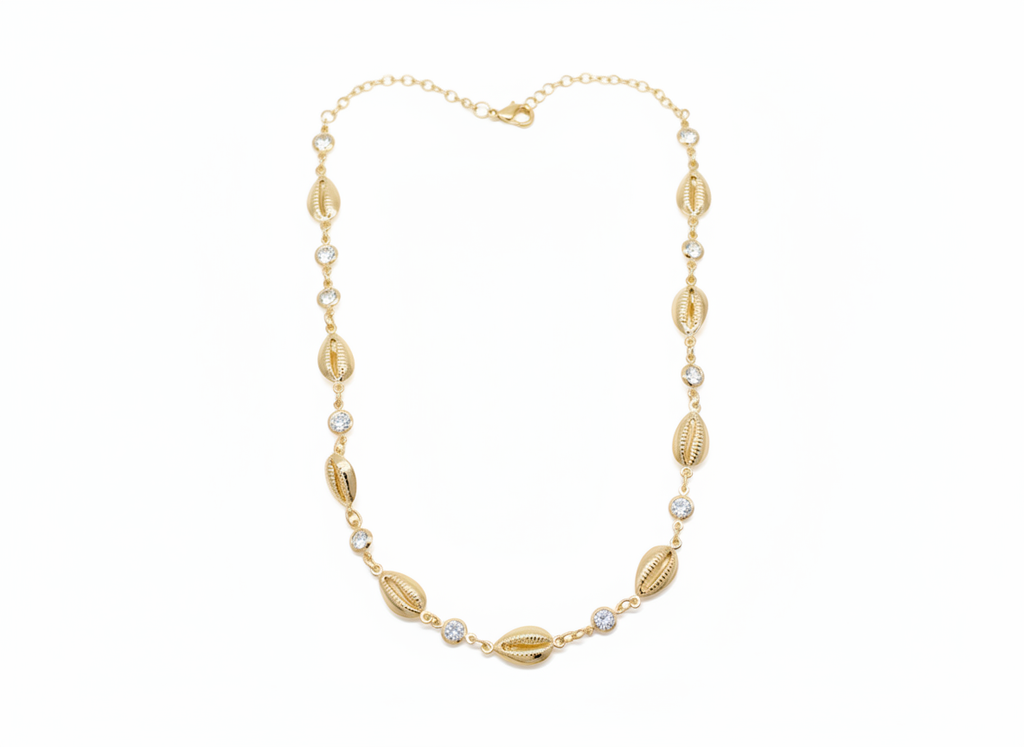 A tribute to the sun-kissed curve of your back and the stories the ocean whispers, this necklace pairs golden cowrie shell silhouettes with luminous crystal accents. Each element is delicately spaced to echo the rhythm of waves meeting shore—fluid, intentional, and unforgettable. Whether layered over linen or worn solo against bare skin, Back to Gold invites you to reclaim your radiance, one shimmer at a time.
