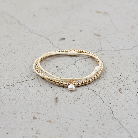 Organic texture meets timeless charm in the Drifter Pearl Bracelet. A strand of gleaming gold-toned beads is gently intertwined with soft cream cord, creating a tactile contrast that feels both grounded and refined. At its heart, a single pearl charm dangles like a quiet treasure—symbolizing serenity, wisdom, and the beauty of simplicity.